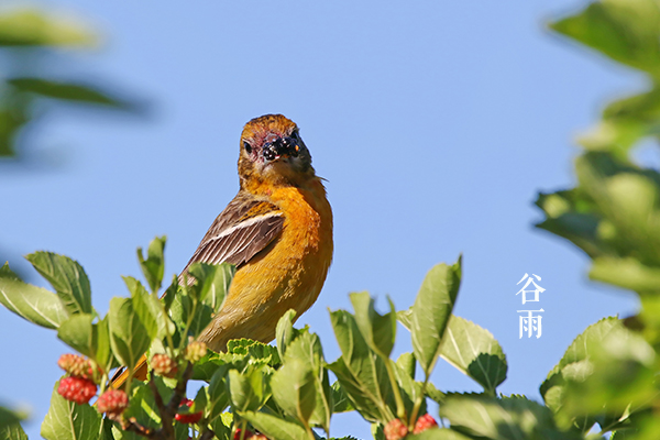 戴胜降于桑:戴胜状似雀,头有冠,五色如方胜,故称。伯劳飞过声局促,戴胜下时桑田绿。谷雨时节,它降落于桑树之上,是蚕将生之候。